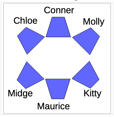 The girls sat Maurice and Conner opposite each other, Midge and Kitty sat either side of Maurice, Molly and Chloe either side of Conner. Maurice and Conner both found themselves with their knees touching those of the girls either side of them, the girls had placed the chairs very close together.