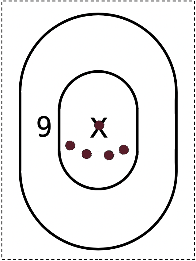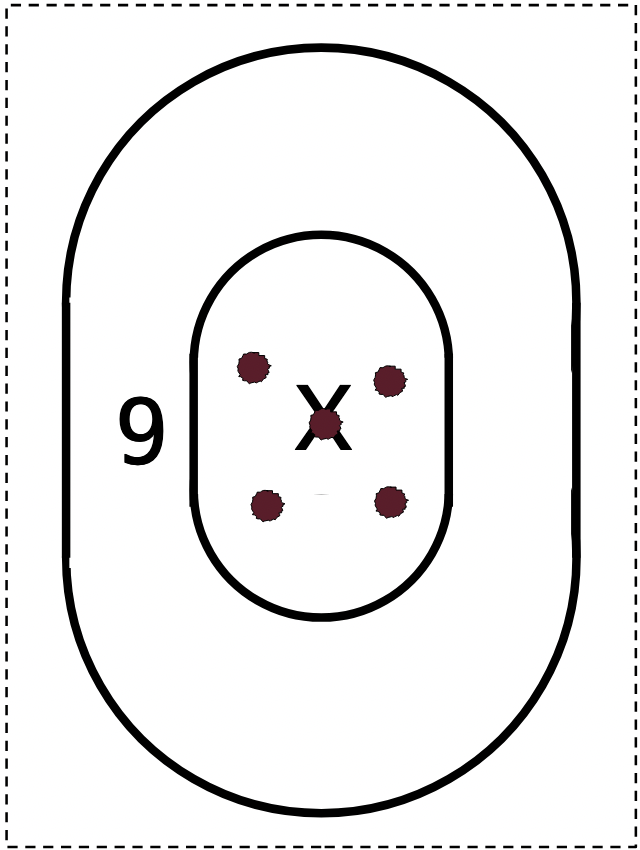 When finished, she stayed down until the other four had all finished. When the five's targets were examined by the three judges, they found that four of the five had close groupings right in the centre of the X‑ring. But Kitty's were different, one shot right in the centre, the other four were all within the X‑ring, but arranged in as the corners of a square, so looking something like the five‑spot face of a die.