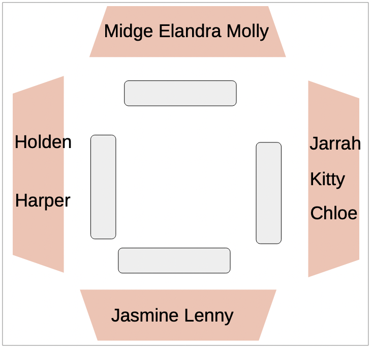 As he usually did for Midge, their table was placed in the centre of the dining area. It was set with four seats along each side and three at each end, Midge had asked for this arrangement to give the best chance for everyone to be able to talk to anyone else (George had said a round table with fourteen places wasn't really practical.) They sat themselves at the table, it seemed that Midge and Molly both wanted to be beside Elandra, they sat at one end with Elandra between them. Round from Midge were Natalie, Harper, Audrey and Jasmin, at the other end were Chloe, Lenny and Kitty (somehow Kitty and Chloe had shepherded Lenny to sit between them), then on the last side were Samuel, Holden, Daniel and Jarrah. Jasmine, with a smile on her face, told Lenny "Behave yourself with those two, won't you?" A somewhat red‑faced Lenny nodded, he might have been heard as he muttered "It's not me that needs telling."
